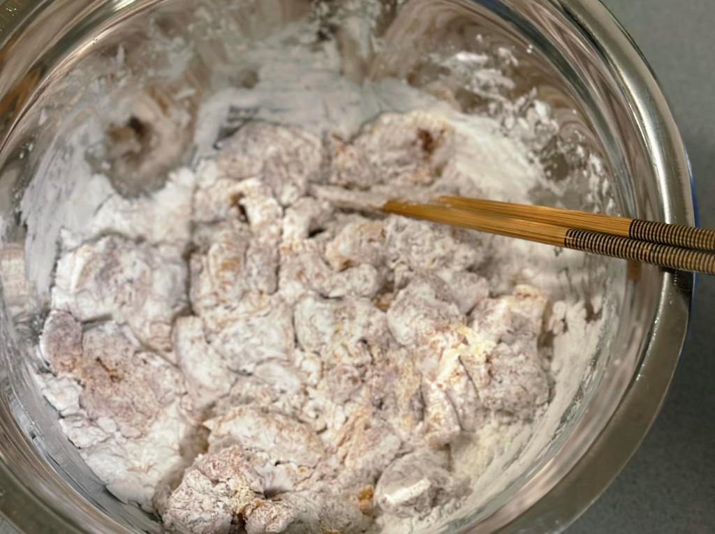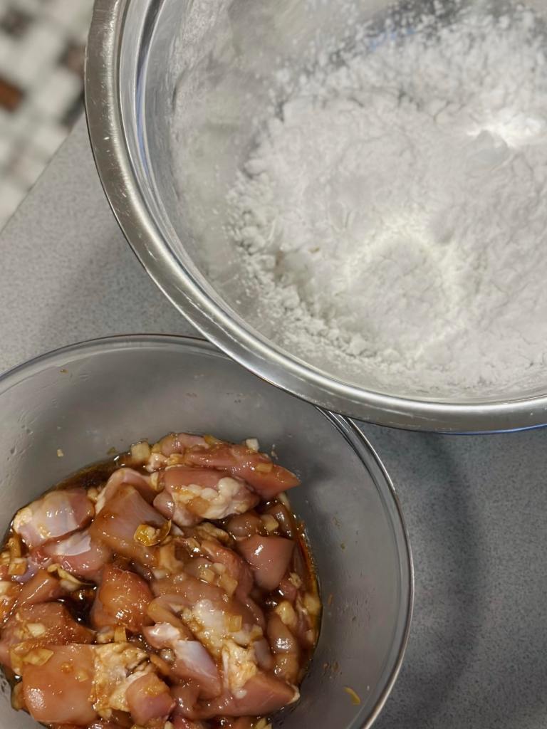 - Lightly dredge the marinated chicken piece in the potato starch and dust off the excess starch.