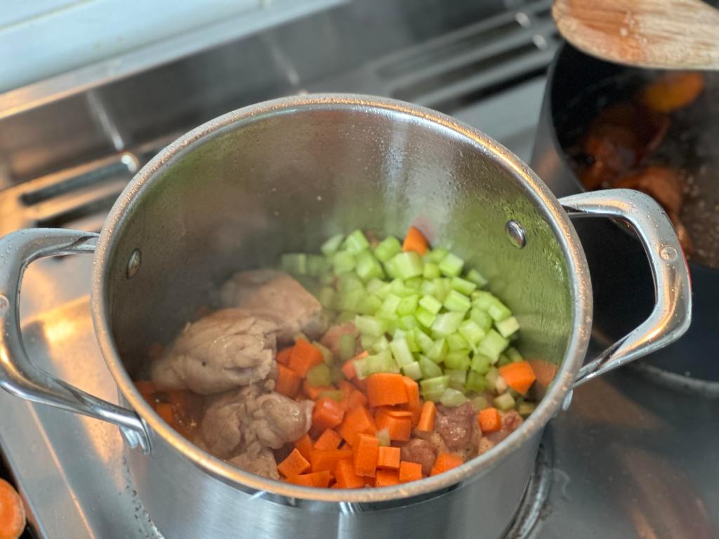 - Once your chickens are almost well-down, add in diced celery and carrots.