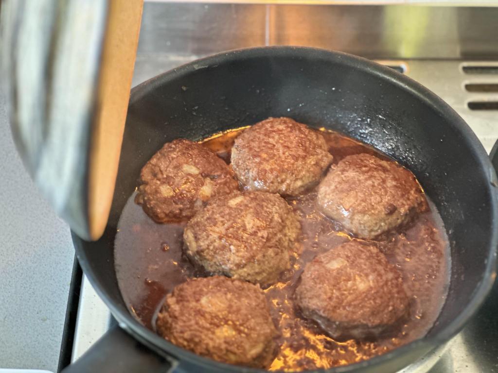 - Once the sauce is nice and thick, add the patties back in one at a time, rolling each one around to glaze it with the sauce.