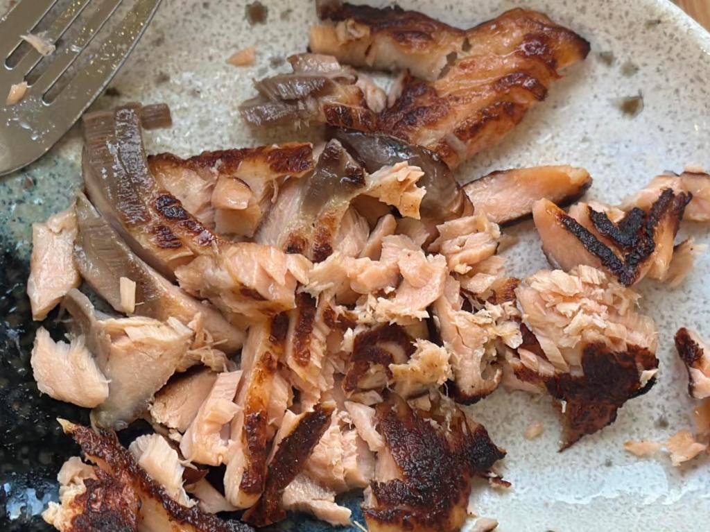 - Break your grilled salmon into pieces so it looks like flake salmon.