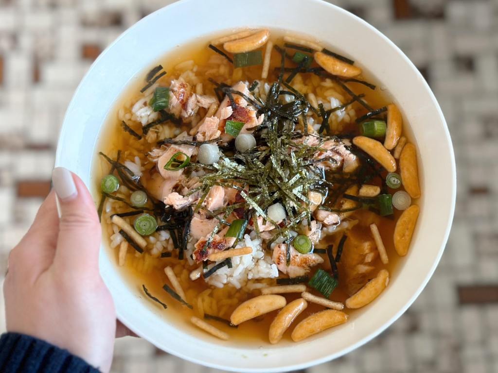 Ochazuke is a simple rice dish made by pouring tea over cooked rice, with toppings of your choice. I usually love a nice simple crumbled salted salmon on top of my ochazuke.