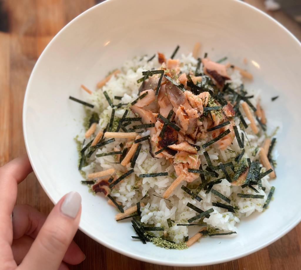 - Plate your rice in a bowl and the salmon on top of your rice. Scatter instant Nozawana Chazuke over your rice.