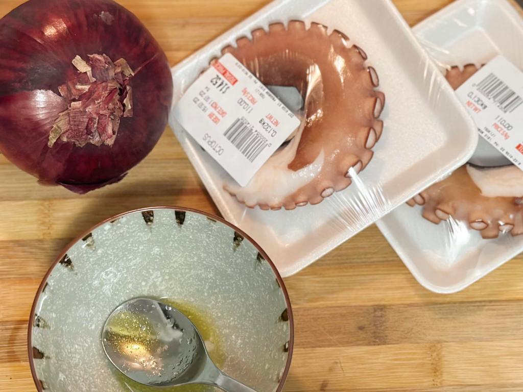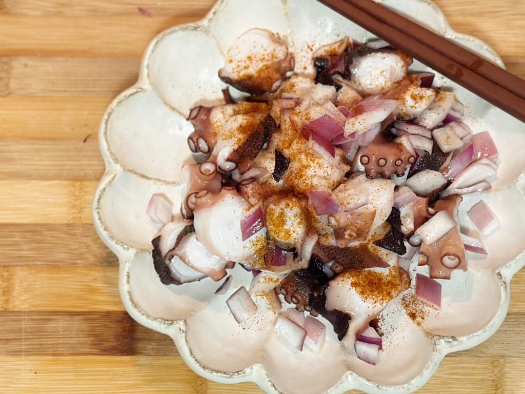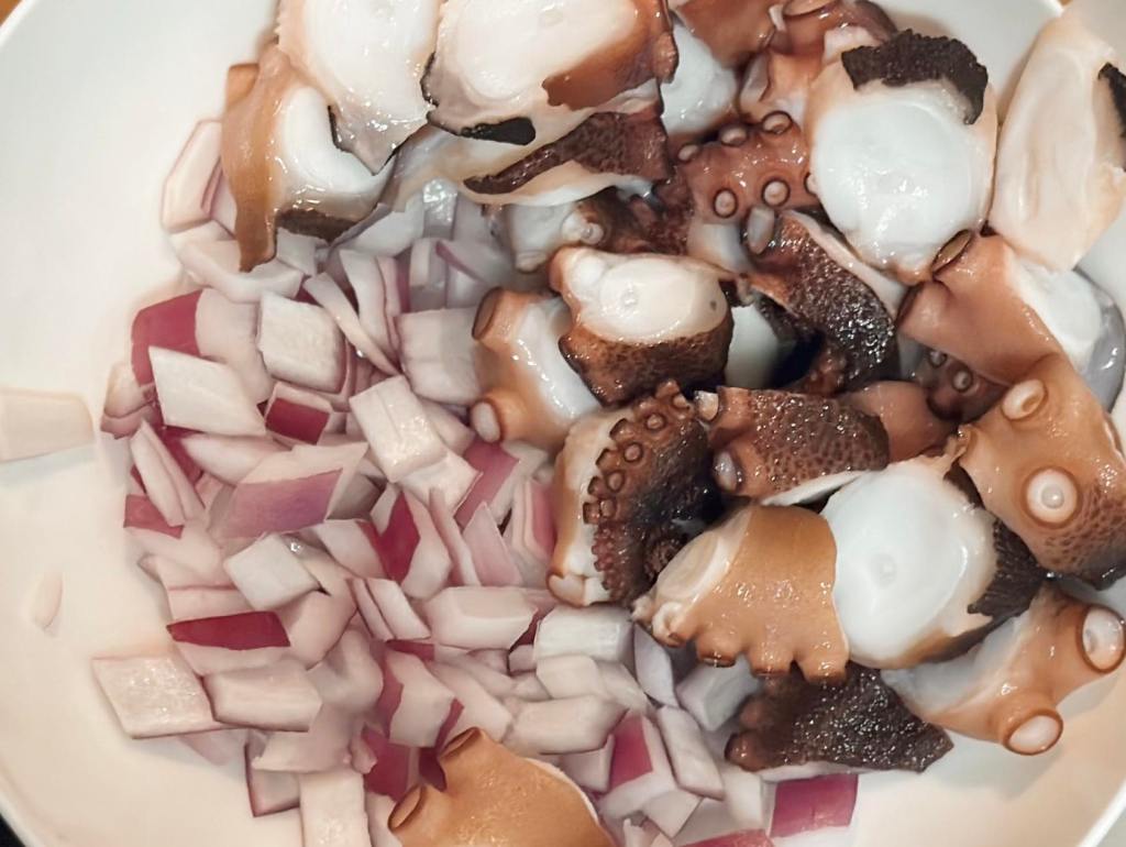 - Minced the red onion and slice octopus diagonally; placed everything in a bowl.