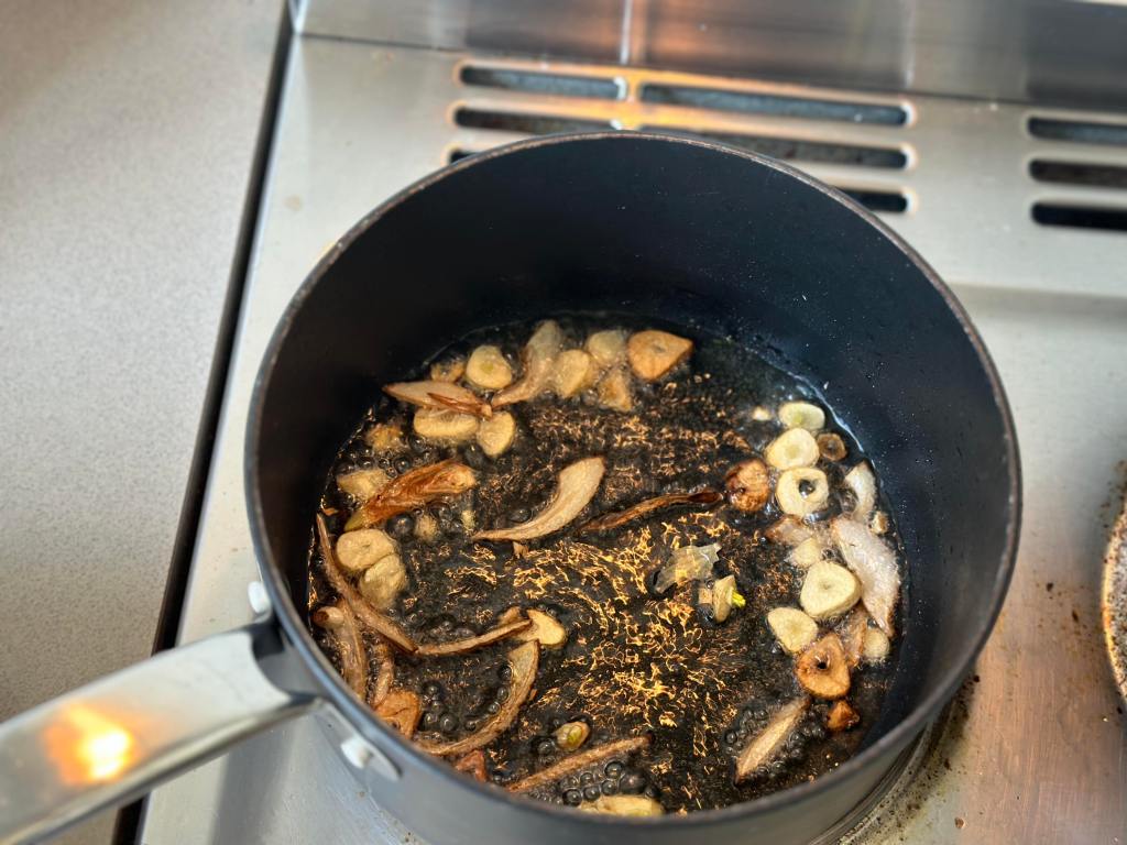 - Roughly chop the garlic and shallot. Fry your chopped garlic and shallot in a small pan with cooking oil (vegetable or sunflower oil) on medium heat for 8 to 10 minutes.