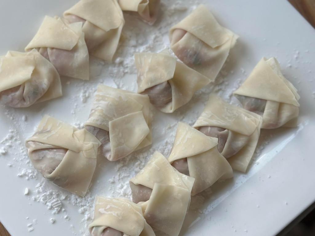 - Dab one of your finger in the water and wet the top corner of your wanton wrap. Proceed to drag the lower corner and slap it to the top corner of wanton wrap that was dabbed with water. The water helps in ensuring the corners sticks. Then continue to bring both corners (right and left) to the top corner.
