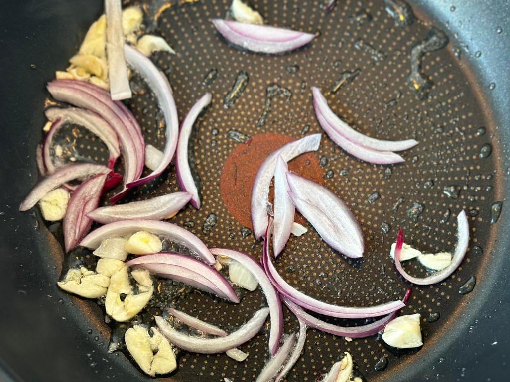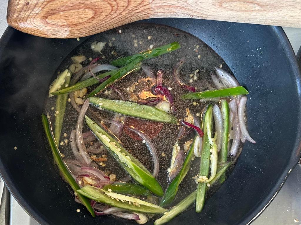 - Heat a pan and add normal cooking oil (vegetable cooking oil). Add the sliced onion, chillies, and chopped garlic. Give them a quick toss before adding 1 cup of water.