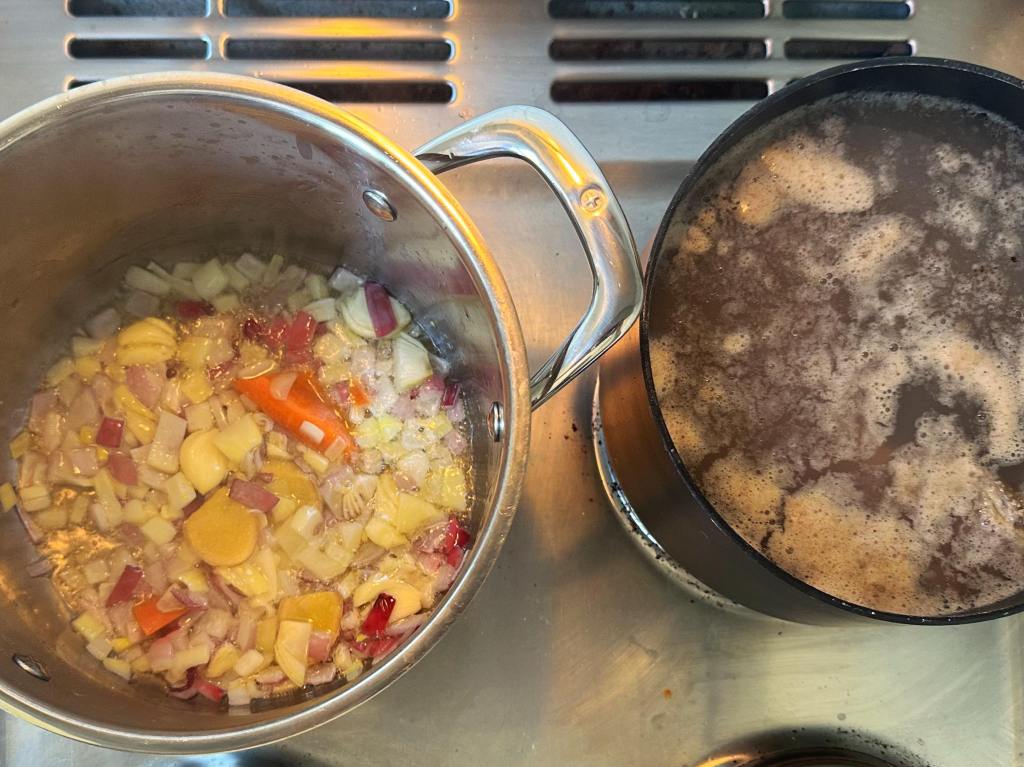 - In another pot, add cooking oil then sauté garlic, ginger, shallots and oin medium heat till fragrance.