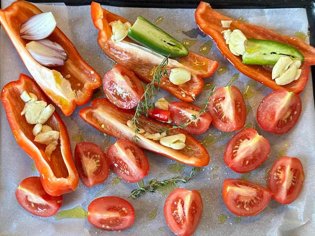 - Chopped up your shallot, garlic, red bell pepper and jalapeno. Place the chopped vege on the oven tray, drizzle with olive oil and seasoned it with salt. Roast your veges in the oven for 30 to 40 minutes at 220˚C.