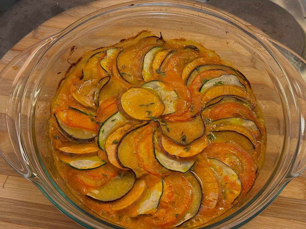 - Pour your sauce into the pan you’ll be using to roast your Ratatouille dish and arrange the veggies in alternating slices, (for example, eggplant, tomato, squash, zucchini) on top of the sauce, working from the outer edge to the center of the pan.