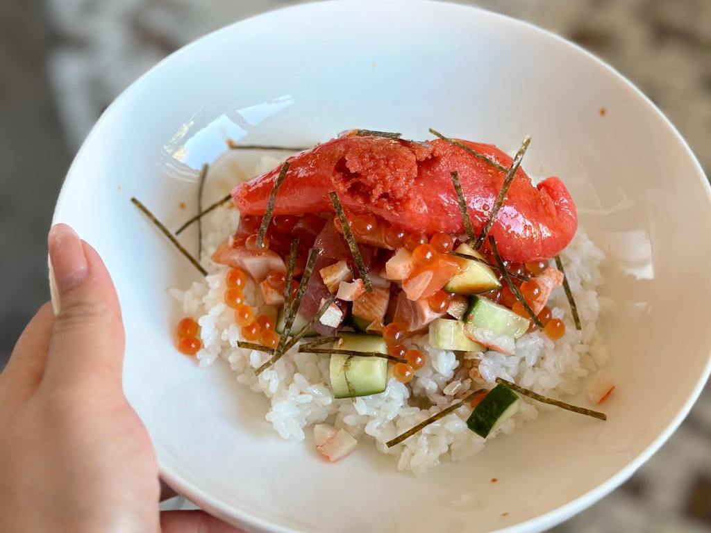 When done, place the rice in a bowl and add the sashimi toppings on top of your rice. Sprinkle Ikura after you place your topping on the rice.