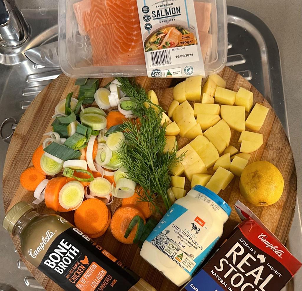 - Prep your ingredients by cutting the leeks into thin strips. Chop and slice the carrots and cut the potatoes into cubes. Cut the fresh salmon into large cubes and your dill dill finely. Set the salmon and dill aside.