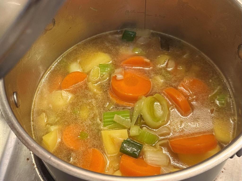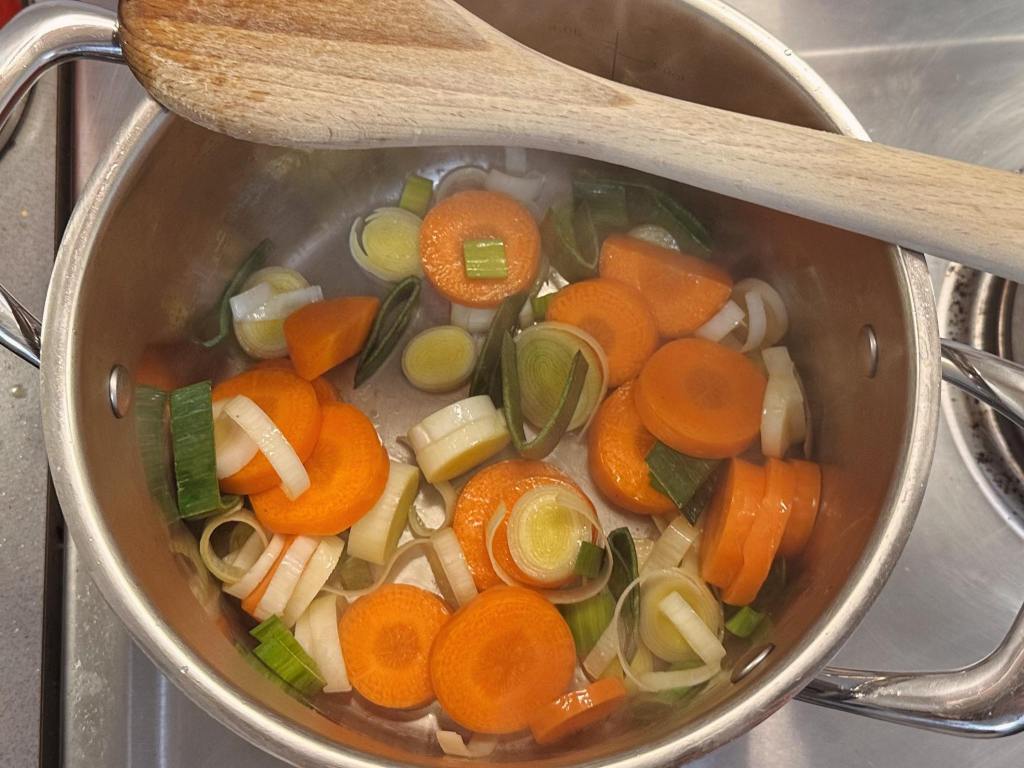 - In a large pot, sauté the leeks and carrots in butter and olive oil.