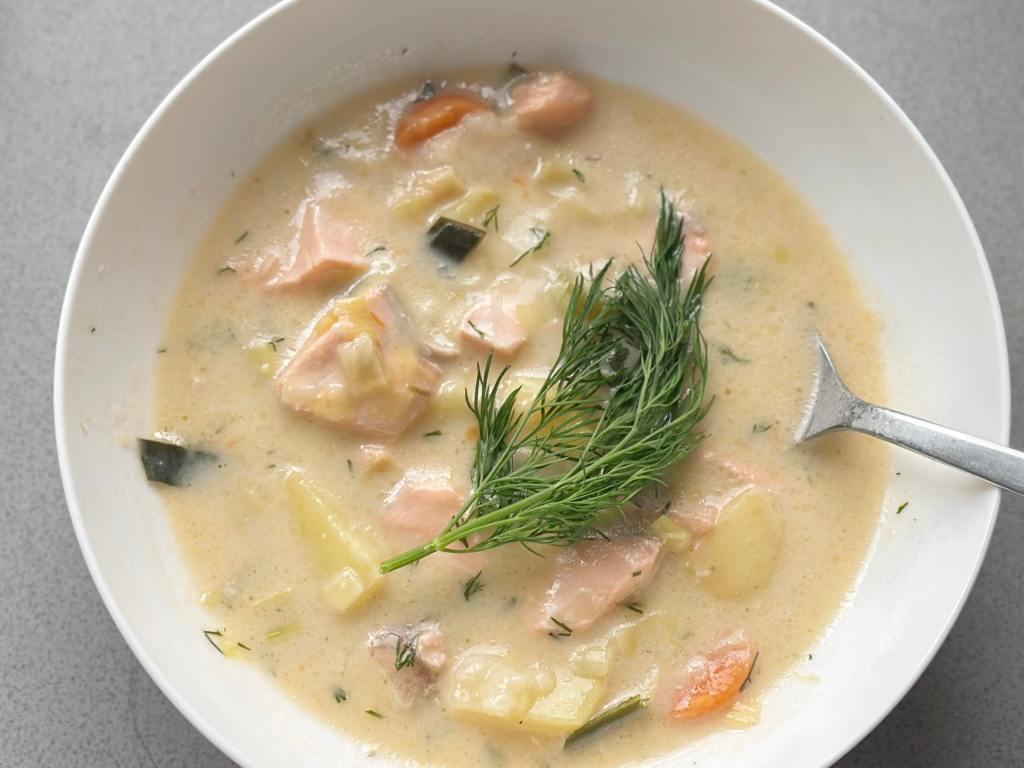 30-minute easy and healthy recipe, perfect for cold winter nights: a Finnish salmon soup. Lohikeitto as it is called in Finland is a creamy salmon soup made with leeks, potatoes and top with dills! The recipe below suits 2 persons portion.