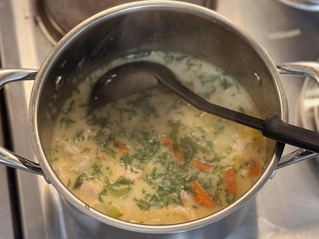 - 10 minutes before serving, add the salmon chunks and 300 ml of cream. Cook over medium heat for 3-5 minutes until the salmon is cooked. Add corn flour to your soup if you like a more thicker texture.