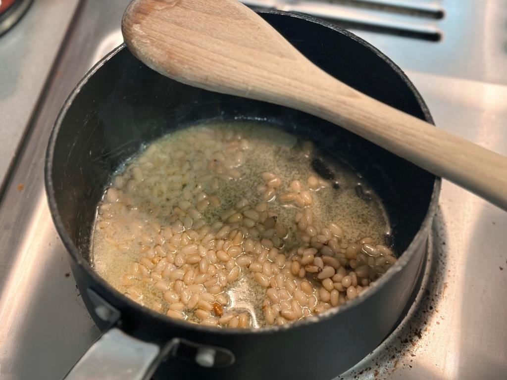 - 10 minutes before your ingredients are done roasting in the oven, heat up the pan/ small pot under medium heat to briefly fry your pine nuts with butter.