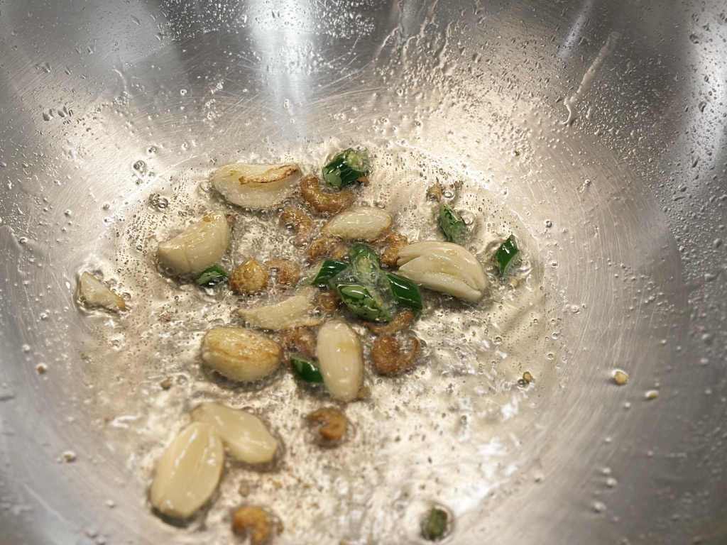 - Heat up some vege cooking oil in a wok and stir fry the dried shrimp, chili and garlic.